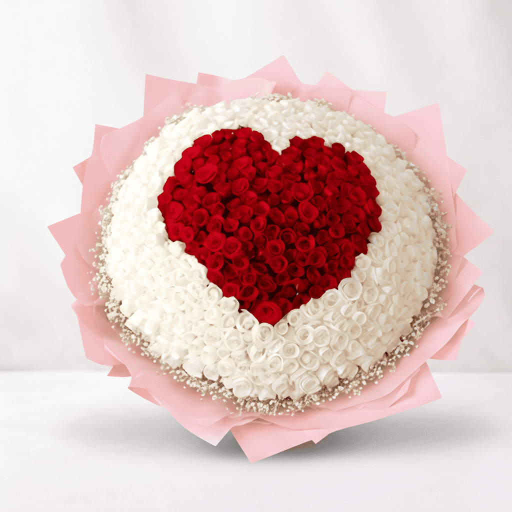 Expert florists at GiftyGram Flowers meticulously arrange the roses into a grand, voluminous composition, enhanced with heart‑shaped red floral detailing that adds depth, symbolism, and visual drama. The sheer size and fullness of the bouquet create an unforgettable presence — one that instantly captures attention and conveys a message of deep, unwavering affection. This is the ultimate romantic gesture, perfect for milestone anniversaries, proposals, grand celebrations, or moments when you want to create a memory that lasts a lifetime.